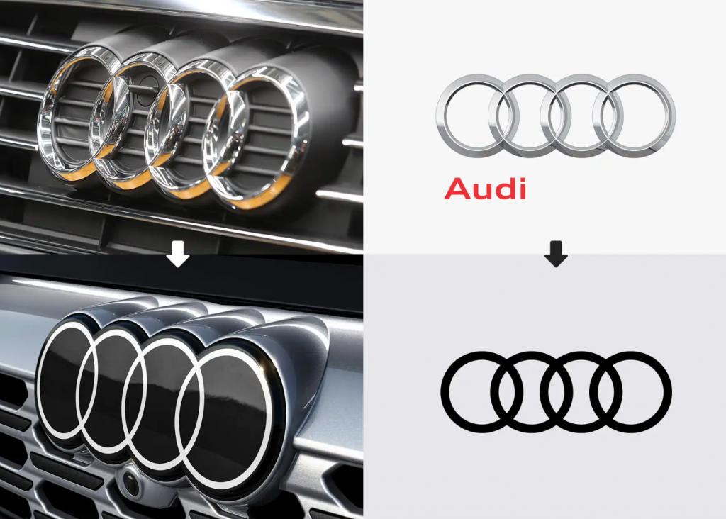 奥迪于 2022 年 11 月发布全新品牌标识,新标采用新扁平化四环标志,表面不再使用镀铬,而是由白色和黑色形成高对比度的视觉效果。