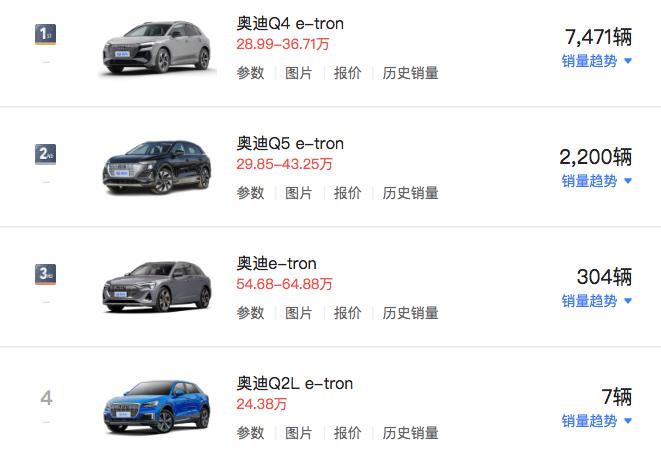 当前奥迪在华共布局一汽 - 大众、上汽奥迪和奥迪一汽三家合资公司,其中奥迪在奥迪一汽中拥有更多的主导权,该公司专注于新能源汽车发展,被视为是奥迪在中国乃至全球扩大电动车车型阵容的关键。截至目前,官网显示,奥迪在华在售的新能源汽车包括 Q2L e-tron、A6L e-tron、Q4 e-tron、e-tron、Q5L e-tron 等,但销量表现并不出色。零售数据显示,今年上半年,奥迪销量最高的车型为 Q4 e-tron,销量为 7471 辆,Q5 e-tron 为 2200 辆,e-tron 为 304 辆,Q2L e-tron 仅 7 辆。
