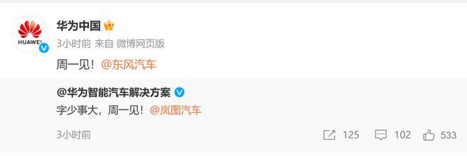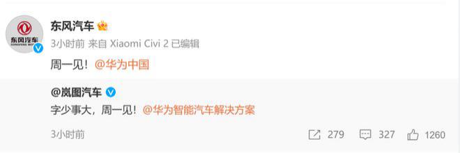 1 月 20 日,东风旗下的岚图汽车和华为智能汽车解决方案在微博上突然隔空喊话:" 字少事大,周一见!"