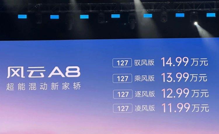 此次风云 A8 推出了 4 款车型,售价区间为 11.99 万 -14.99 万元,并且下定 2000 元可抵扣 10000 元,相当于直降 8000 元。官方表示:该车是 "15 万以内最好的混动家轿 ",将全面搅动新能源市场风云。其实提起风云,有点年纪的消费者应该并不陌生,在 25 年前,奇瑞生产的第一款轿车 " 风云 " 下线,这是奇瑞汽车的一个全新的起点。