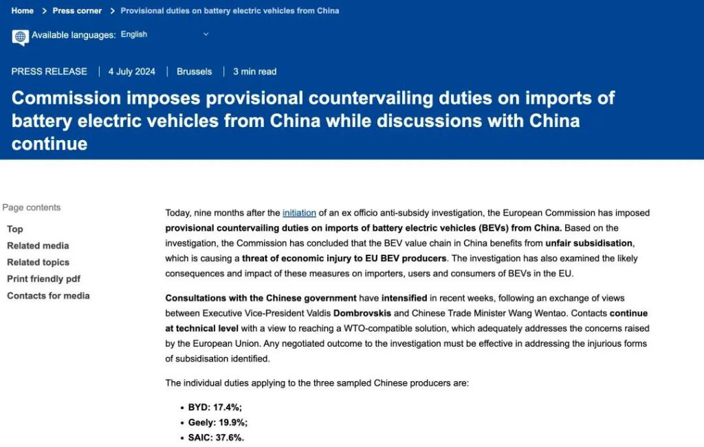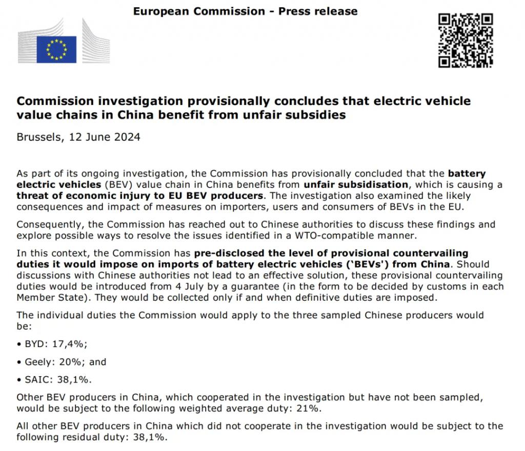 今年 6 月,欧盟突然宣布增加中国车企关税。官方发布文件称:无法与中方达成解决方案,将在 7 月 4 日开始针对来自中国的电动汽车加征临时关税。根据文件显示,将分别对比亚迪、吉利汽车、上汽集团三家车企加征 17.4%、20.0% 和 38.1% 的关税,对参加调查但未被抽样的中国汽车制造商将征收 21% 的关税,未配合调查的中国电动汽车制造商将加征 38.1% 的关税。