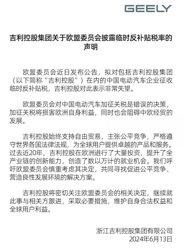 彼时,针对欧盟发布的这一消息,上汽集团回应表示:" 未来,上汽集团将继续与全球合作伙伴保持并放的沟通和合作。我将密切关注事态的发展,并采取一切必要的法律和商业措施,切实保护自身的合法权益和全球客户的利益。" 吉利汽车回应指出:该决定是错误的决策,加征关税将损害欧洲自身利益,同时也会阻碍中欧经贸的发展。