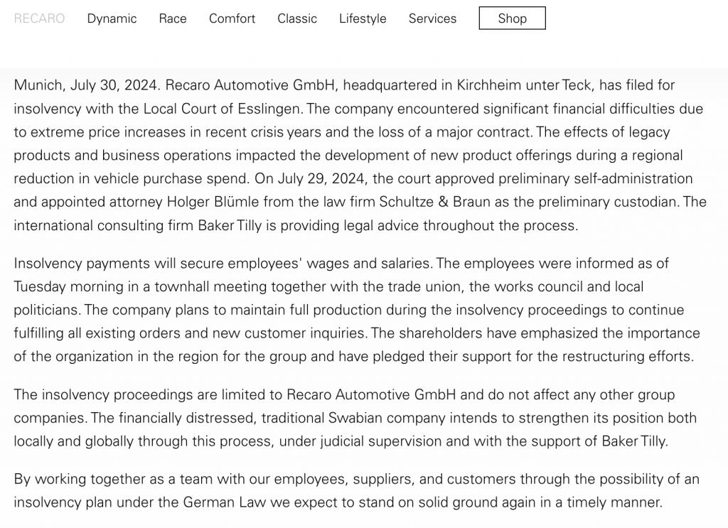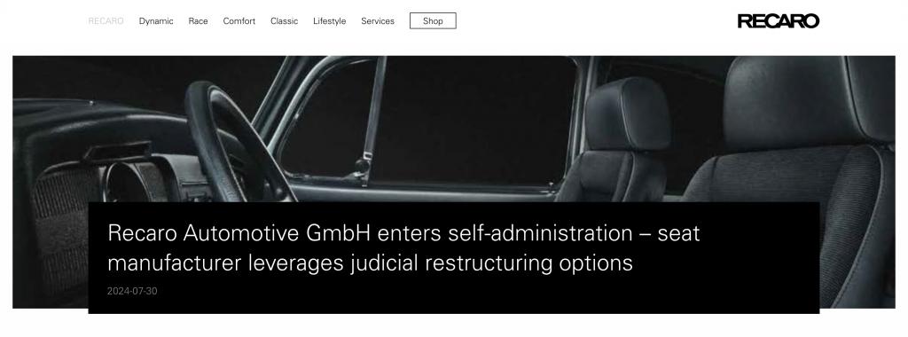 日前,德国汽车座椅制造商 Recaro Automotive 宣布,总部位于基希海姆和泰克的 Recaro Automotive GmbH 已向埃斯林根地方法院申请破产。