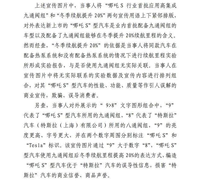 至于众联天下汽车销售服务有限公司为何会被罚?据网上曝光的上海市闵行区市场监督管理局处罚内容显示,2022 年 2 月,众联天下发布的宣传图片中含有 " 哪吒 S 行业首批应用高集成九通阀组 " 和 " 冬季续航提升 20%" 宣传用语,对外表达新上市的哪吒 S 型汽车是业内首批配备九通阀组的车型以及配备后能在冬季提升 20% 续航里程的含义。经查,众联天下上述宣传内容对其哪吒 S 型汽车的性能、功能、质量等作引人误解的商业宣传,欺骗、误导消费者。另外,宣传图片中标注 9 大于 8 文字图形组合,9 代表哪吒 S 所用的九通阀组,8 代表特斯拉所用的八通阀组,9 的亮度更高、字号更大,并在两个数字周围分别标注哪吒 S 和 Tesla 标识。该宣传图片通过 9 大于 8、哪吒 S 使用九通阀组后冬季续航里程提高 20% 的表达方式,编造哪吒 S 优于特斯拉的误导性信息,损害特斯拉汽车的商业信誉、商品声誉。
