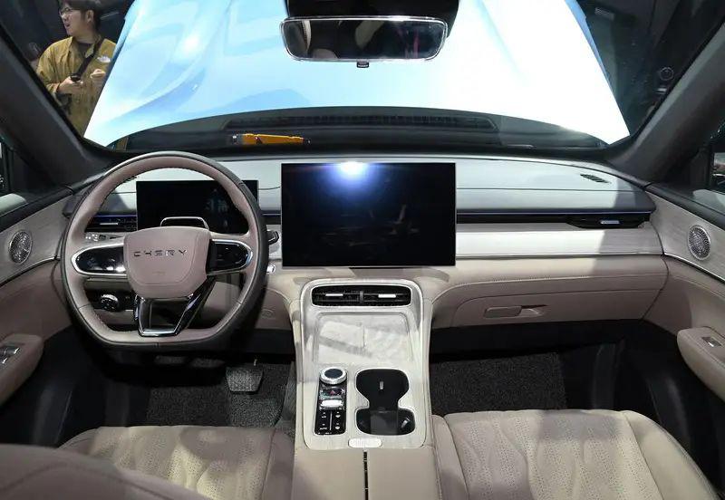 车内的设计更接近新能源车型的风格,再加上米色的内饰,看上去十分简洁。此外,新车还配备有液晶仪表和独立中控大屏,我们还可以看到带出风口的无线充电面板以及模式转换旋钮等。