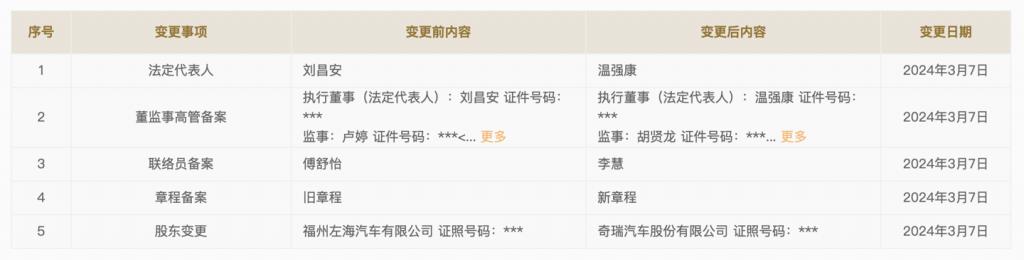 IT 之家 3 月 10 日消息,国家企业信用信息公示系统显示,福州青口控股有限公司在 3 月 7 日发生工商变更,原全资股东福州左海汽车有限公司退出,新增奇瑞汽车股份有限公司为全资股东,刘昌安卸任法定代表人、执行董事、经理,由温强康接任。