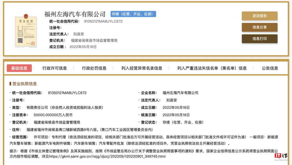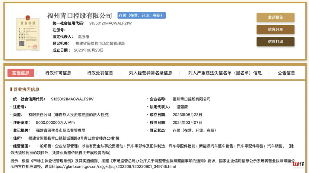 IT 之家从公示系统中获悉,福州青口控股有限公司成立于 2025 年 8 月,注册资本 5000 万人民币,法定代表人为温强康,经营范围含企业总部管理、汽车零部件及配件制造、新能源汽车整车销售等。目前该公司共获得一轮融资,投资方为奇瑞汽车。