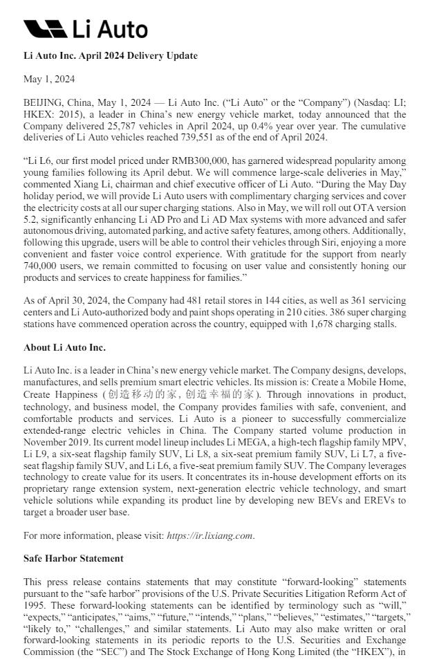 理想汽车 4 月交付 25787 辆汽车,同比增长 0.4%