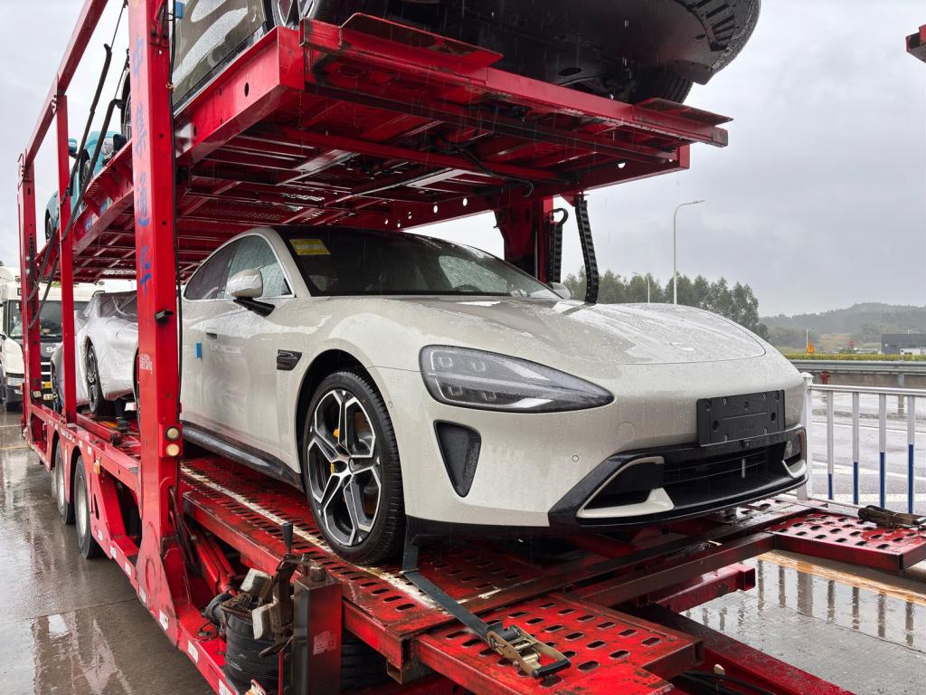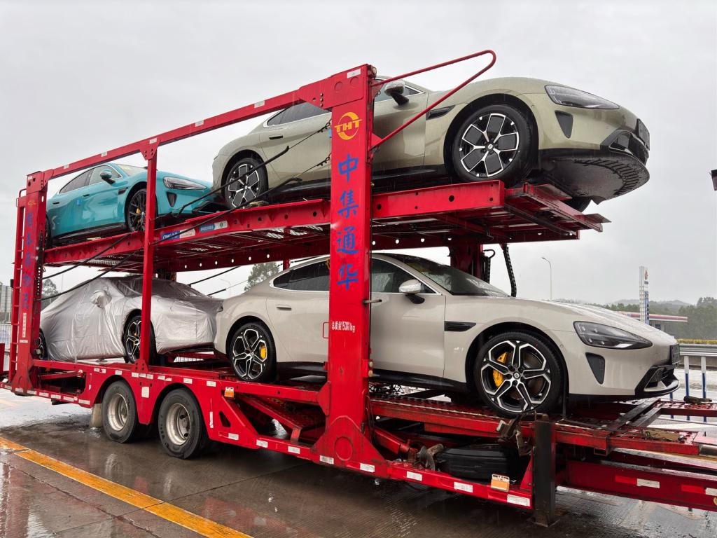 谍照显示多台小米 SU7 汽车已在运输途中:可见蓝灰绿三种配色款