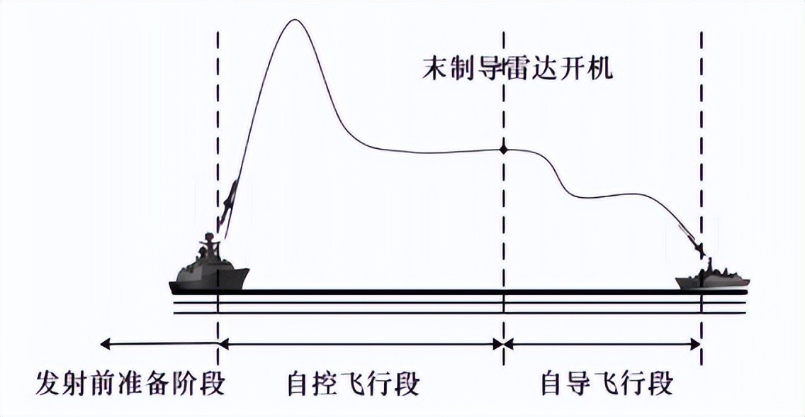 反舰导弹攻击过程主要包括导弹参数装订、发射、中段巡航、末制导雷达开机搜索、捕获目标、跟踪目标、俯冲攻击等。导弹参数装订是在舰载雷达、岸基雷达、机载雷达等情报信息支援系统对目标信息进行测量并进行战术处理后,传送给反舰导弹指控系统对导弹的参数进行预先装订。参数装订完成后,操作人员选择合适的距离范围发射导弹。导弹发射后,首先进入自控段,主要由中段控制装置和高度表控制飞行,进入自导段(弹道末端)后末制导雷达开机,按照预先装订的参数对海面上的目标进行搜索。末制导雷达捕捉到目标后,立即进入跟踪状态,实时调整导弹姿态锁定目标,当弹目距离比较接近时导弹跃升到一定高度对目标进行俯冲攻击。