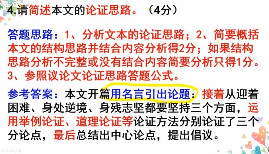 我们答题就需要按这个思路来回答,重要的是主体部分中,把作者用什么论证方法描述清楚。