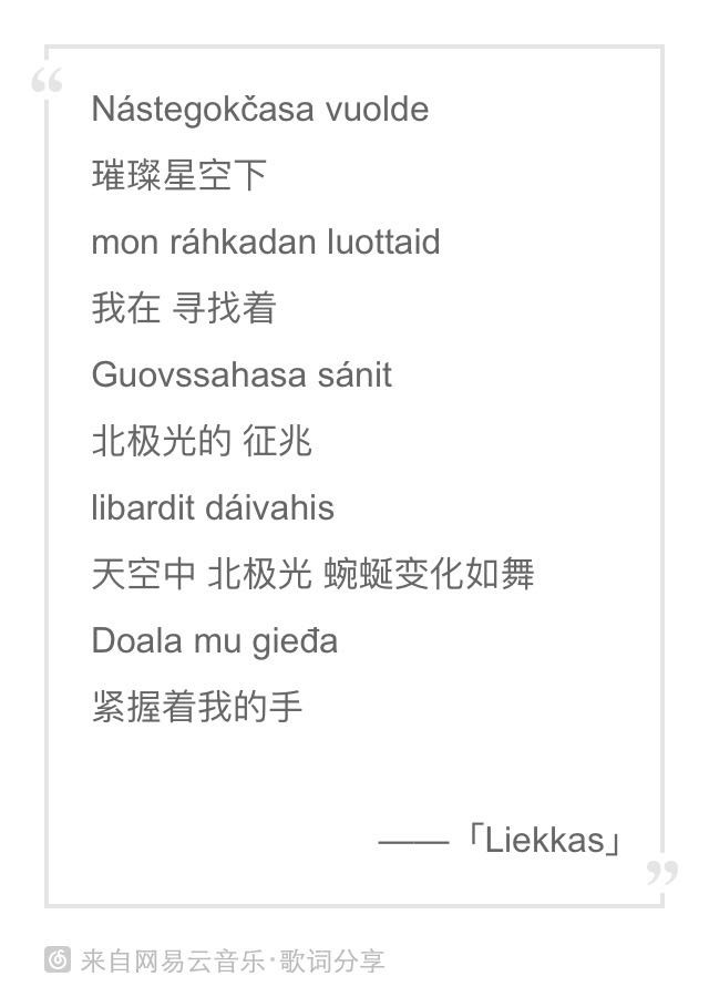 虽然听不懂歌词,但是一曲听罢,总觉得内心平静了许多,还有种叫希望的东西在心里产生。这就是今天推荐的原因。希望大家都能感受到来自北极光的感动。