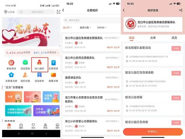 点击功能区的【加入组织】,查找到相应的组织后点击【申请加入】即可。申请加入后,将由该组织的负责人进行审核。在审核通过前,志愿者可【取消申请】。