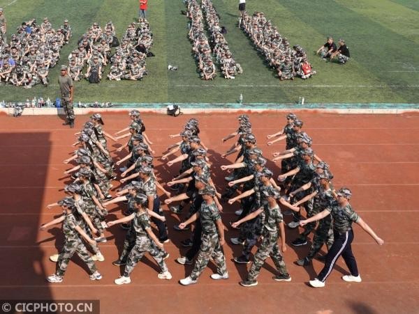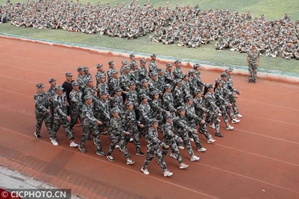 ↑2020年9月2日,在广西壮族自治区南宁市东盟中学操场上,高一新生在进行军训科目训练。CICPHOTO/喻湘泉 摄