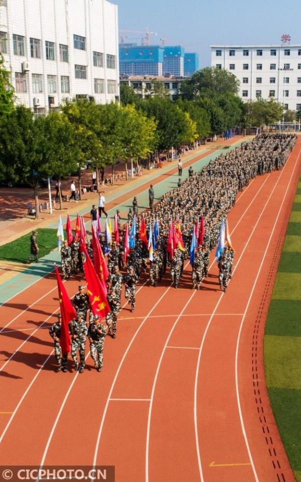 ↑2020年8月31日,在山东省德州市第一中学操场上,1200余名高一新生列队参加军训汇报表演。CICPHOTO/周建新 摄