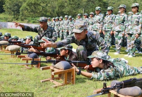 ↑2020年9月2日,在广西壮族自治区来宾市忻城县高级中学操场上,军训教官指导高一新生使用步枪瞄准射击。CICPHOTO/樊绍光 摄
