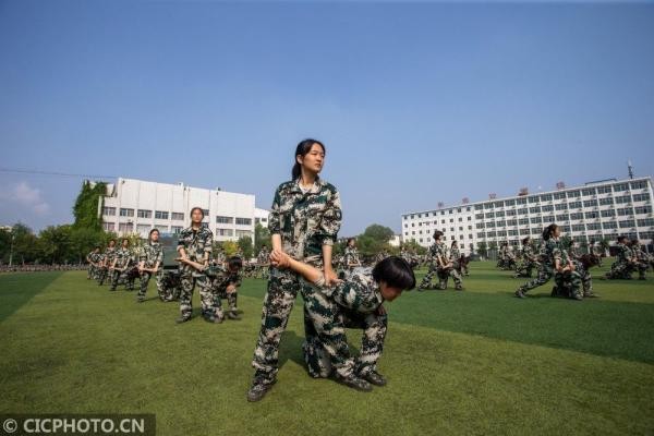 ↑2020年8月31日,在湖南省衡阳市常宁市尚宇学校操场上,高一新生在进行军训科目训练。CICPHOTO/周秀鱼春 摄