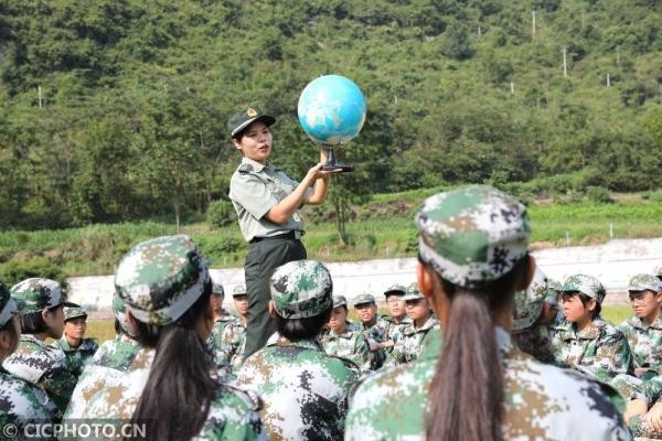 ↑2020年9月2日,在广西壮族自治区来宾市忻城县高级中学操场上,一名军训教官为高一新生讲授军事知识。CICPHOTO/樊绍光 摄