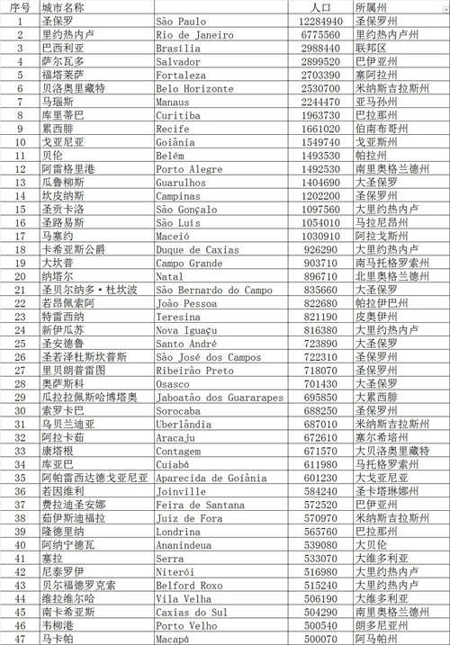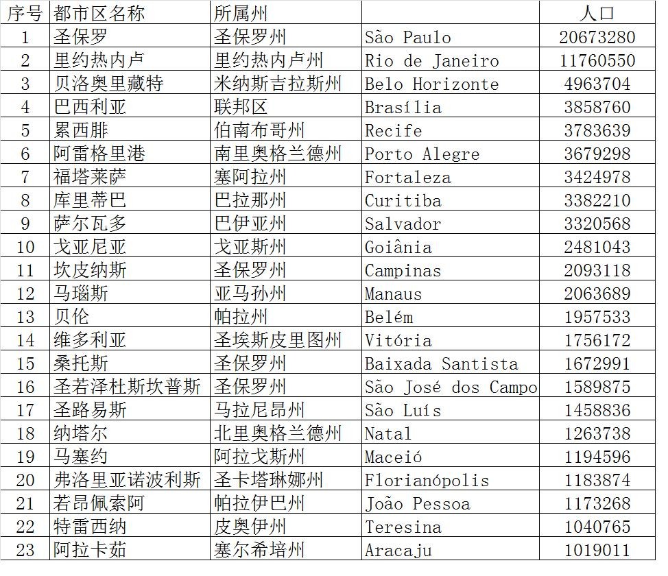 巴西境内人口超过200万的都市区就以上十二个,其他不再一一介绍,详见下表。