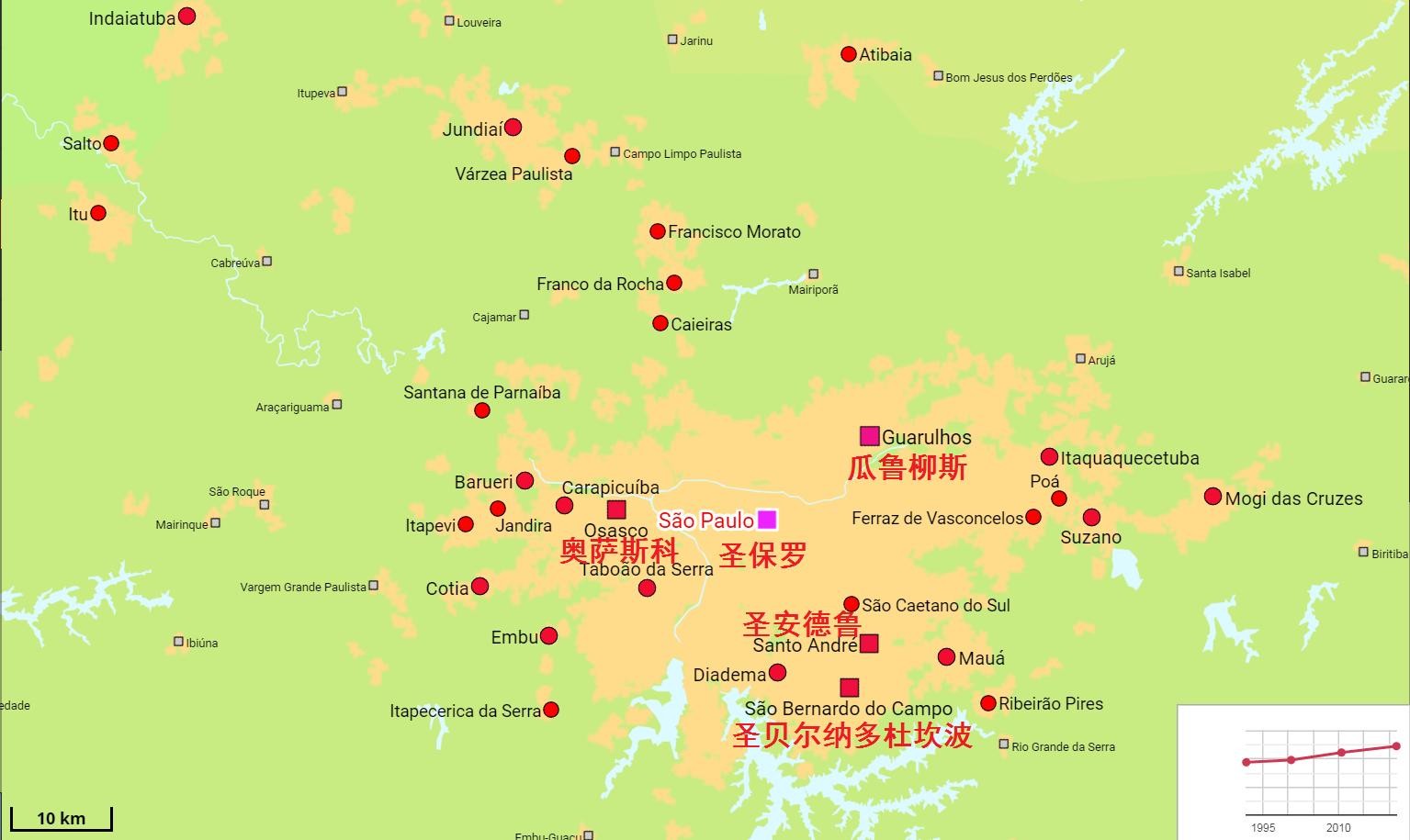 圣保罗是巴西最大城市和经济中心,圣保罗州首府。圣保罗市市区面积1521平方公里,人口1228.49万,圣保罗都市区面积约8000平方公里,人口2067万,是世界特大城市之一。圣保罗都市区内人口超过50万的城市还有:瓜鲁柳斯(140.5万)、圣贝尔纳多·杜坎波(83.6万)、圣安德鲁(72.4万)、奥萨斯科(70.1万)等。