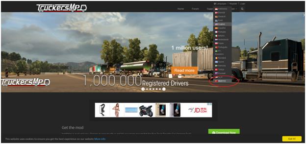第一步,登录http://www.ets2mp.com/en_US进入下面的网址,点击右上角language将网站转换成中文,方便理解(如下图)