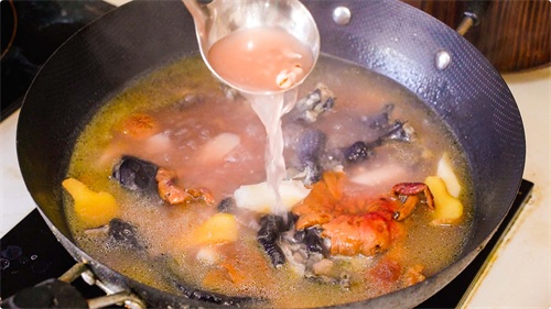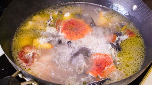 此时下入红菇,进行小火慢炖,然后放入适量的鸡精和盐,熬制30-40分钟左右,这时就可出锅啦!