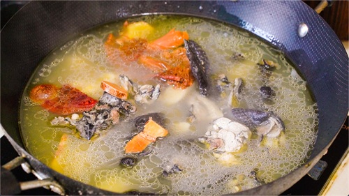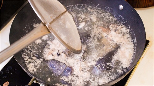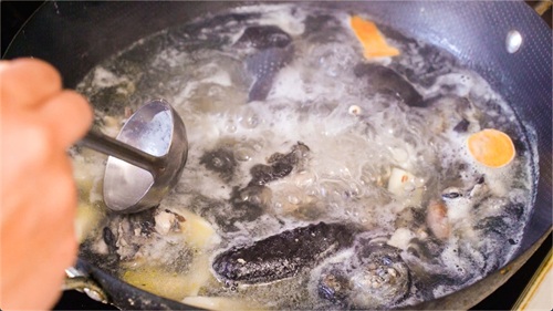 大火将其烧开,把表面的浮沫捞出。