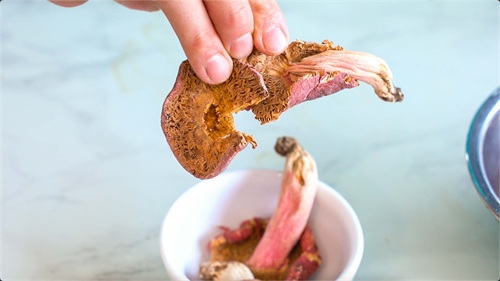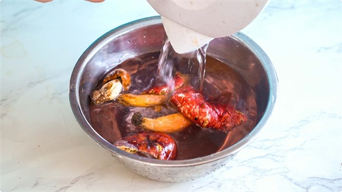 准备好红蘑,放入器皿中,然后倒入适量开水进行浸泡。