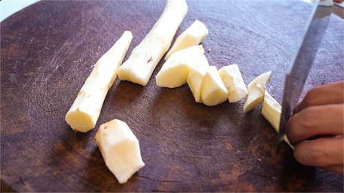 将山药去皮,然后改刀切成小块儿。