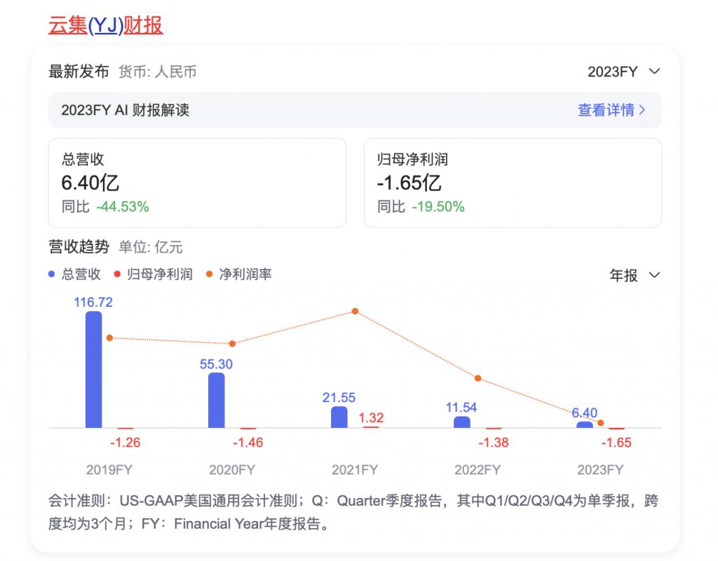 2025-2025 年,云集营收分别约为 116.72 亿、55.30 亿、21.55 亿、11.54 亿、6.40 亿元;归母净利润约为 -1.26 亿、-1.46 亿、1.32 亿、-1.38 亿、-1.65 亿元。