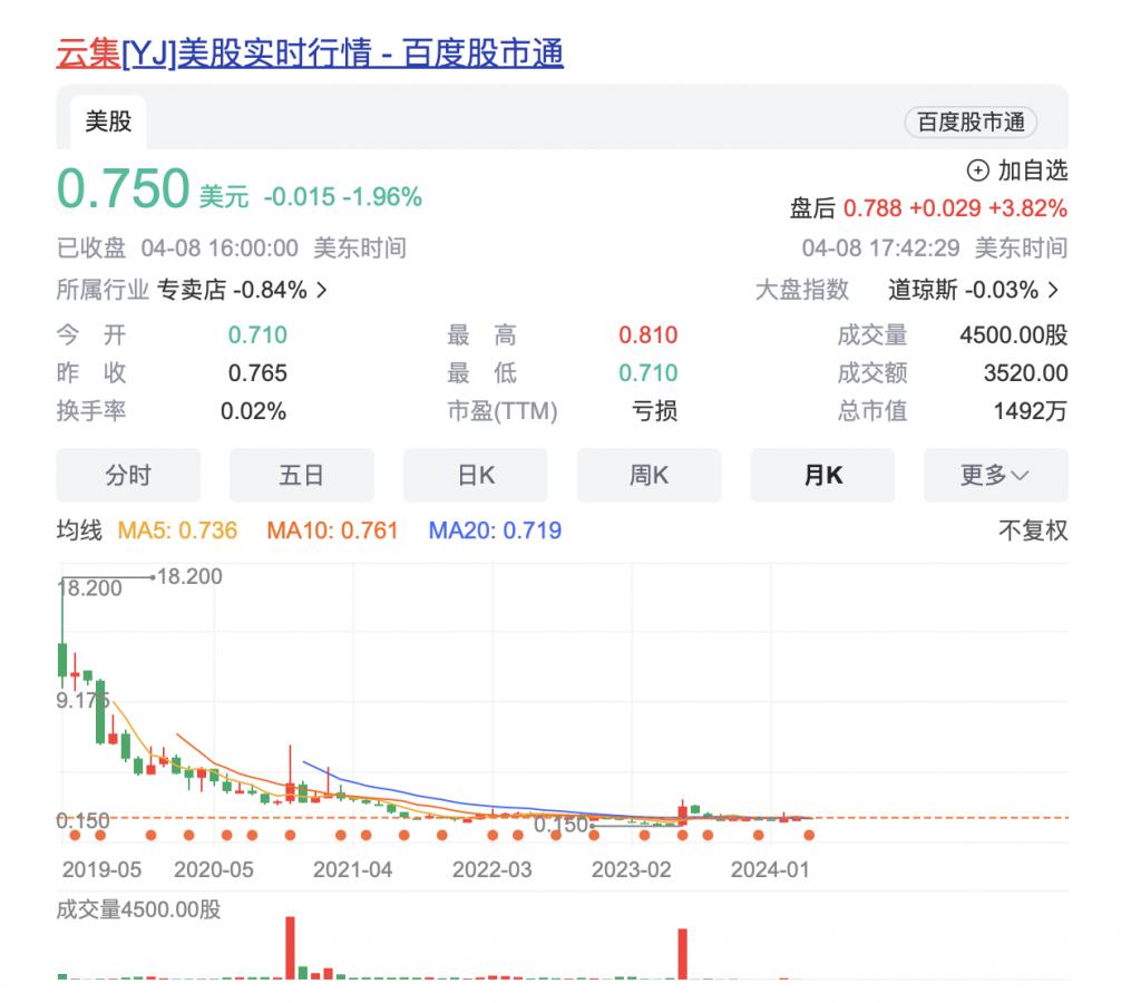 此后,云集股价开启大跳水模式。截至发稿,其股价仅为 0.75 美元 / 股,市值仅剩 1492 万美元,缩水超 99%。