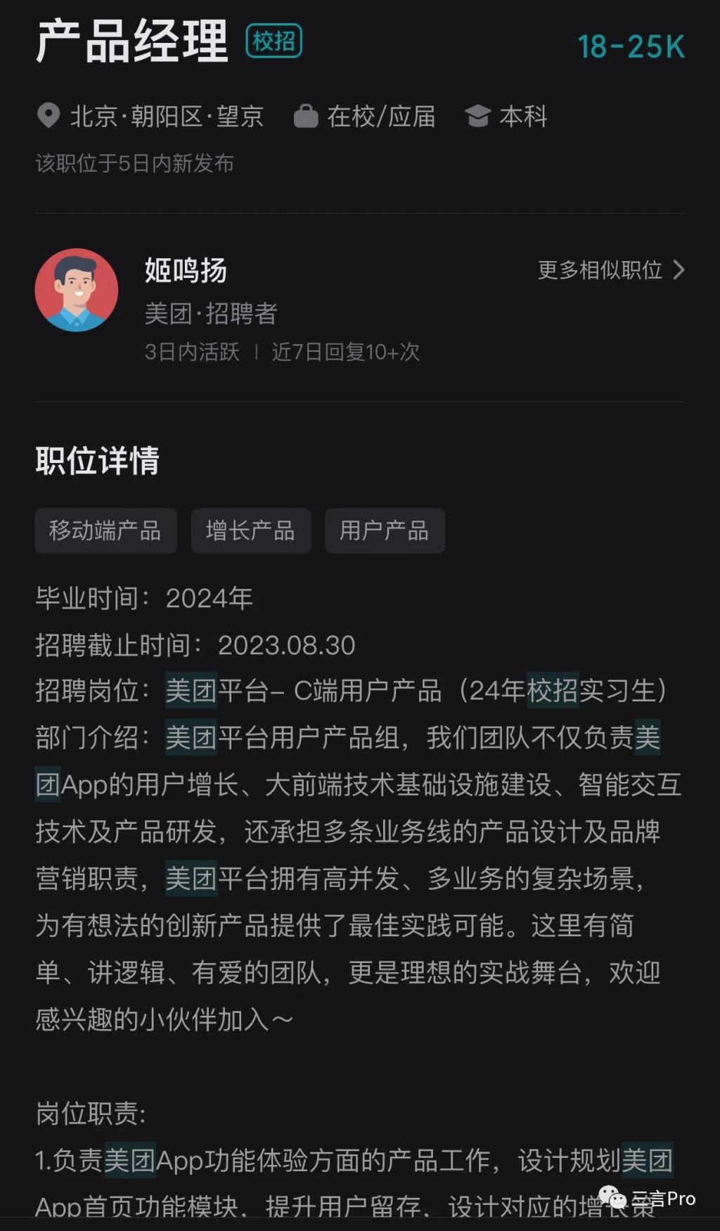 例如美团校招产品经理薪资范围 18-25K;校招专家薪资范围 20-40K;而校招实习生则为 180-220 元 / 天。