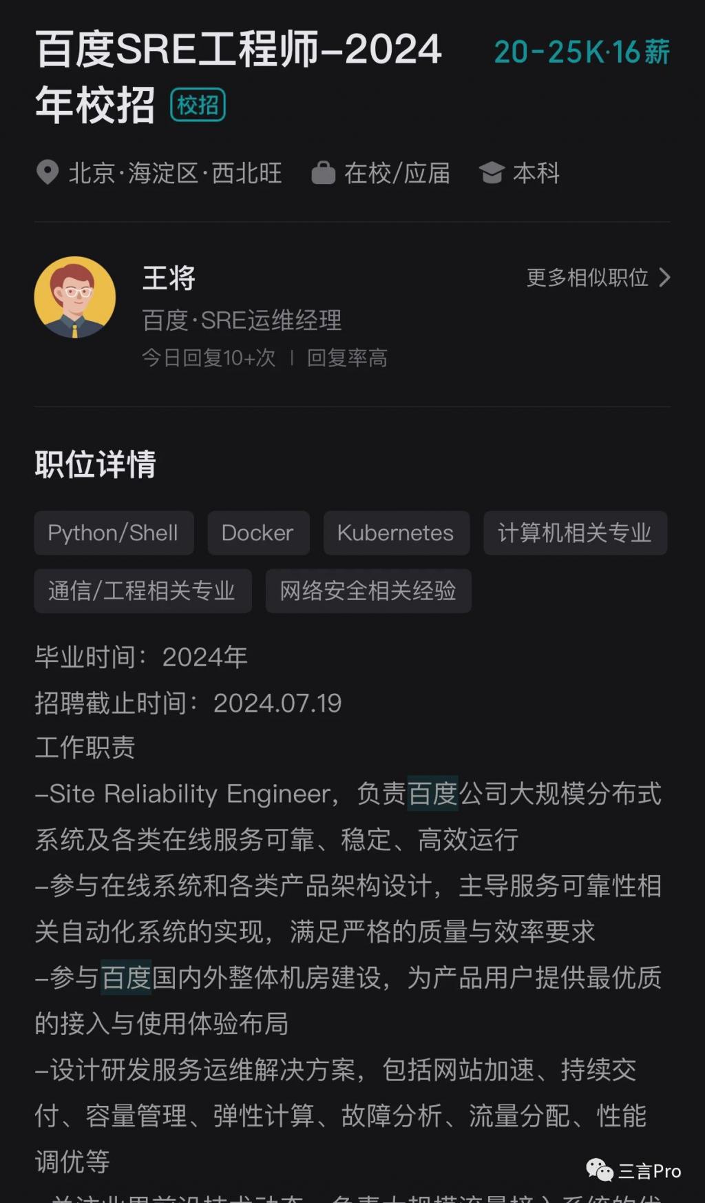 去年,百度发布的 2025 校招信息显示,公司招聘技术类、产品类、用户体验类和专业服务和管理支持类四大方向;