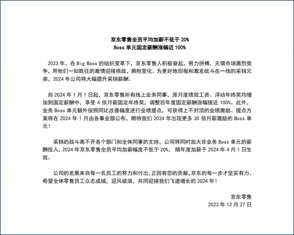 12 月 27 日,京东集团宣布,自 2024 年 1 月 1 日起,京东采销等一线业务人员的年固定薪酬大幅上涨近 100%,2024 年初京东零售全员将平均加薪不低于 20%。