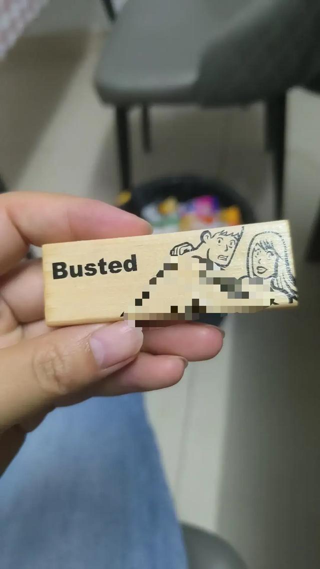 记者注意到,该长条状的积木其中一面印有英文单词 "Busted",旁边的图案则是一对未穿衣服的男女显示出吃惊表情,疑似 " 捉奸 " 场景。英文 "busted" 的形容词意思为 " 被当场逮住 ",动词意思为 " 打破、(使)降级、降低军阶、突击搜查、摔碎 "。