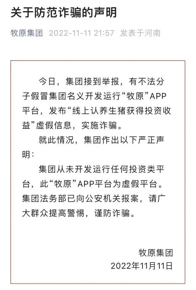 《声明》显示,集团接到举报,有不法分子假冒集团名义开发运行“牧原”APP平台,发布“线上认养生猪获得投资收益”虚假信息,实施诈骗。