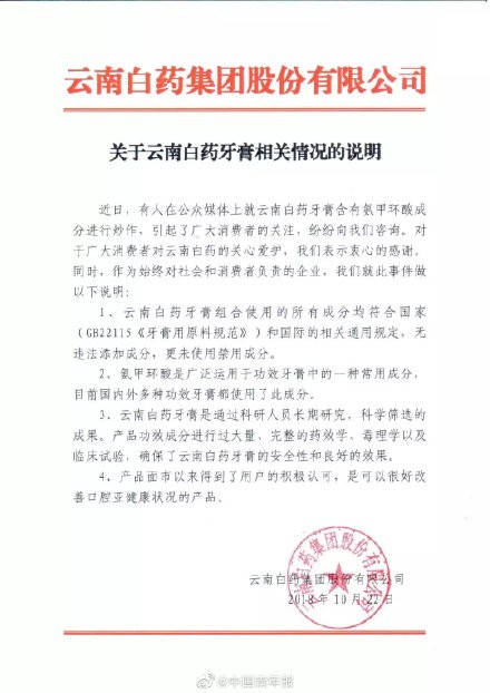 【云南白药牙膏被诉虚假宣传,法院:不存在,驳回】日前,@科普医生博雅 发微博称云南白药牙膏中,起“牙龈止血”作用的很可能是西药成分氨甲环酸(凝血酸)。随后,长沙律师刘高以消费者身份,向长沙市开福区人民法院提起民事诉讼,要求云南白药集团股份有限公司立即停止其牙膏中“云南白药活性成分帮助减轻牙龈出血等”的“虚假宣传”,在全国性媒体公开澄清事实并向全国消费者致歉。今年1月24日,开福区人民法院审理了此案,鉴于案情复杂,当天没有宣判。4月20日,开福区人民法院宣判,依法驳回原告刘高的全部诉讼请求。刘高律师表示,他正在考虑向上级法院上诉。