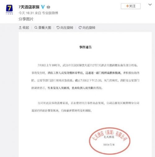 通告指出,事故发生时,酒店工作人员发现楼体异常后,迅速逐一敲门组织疏散撤离,并积极协助消防、公安等部门进行现场应急救援。截止7月8日下午15:00,从门店核实、消防及公安部门的调查显示,暂未发现人员被困,也未收到人员失联的情况。
