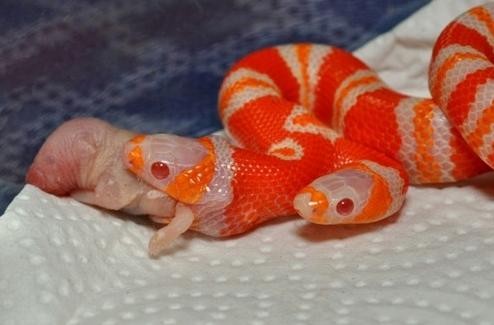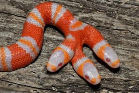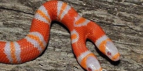 这是一条两个头的白化蛇,他们皮肤有三种颜色,橙色占主导,就连眼睛也是红色的,看它的眼睛多么炯炯有神。