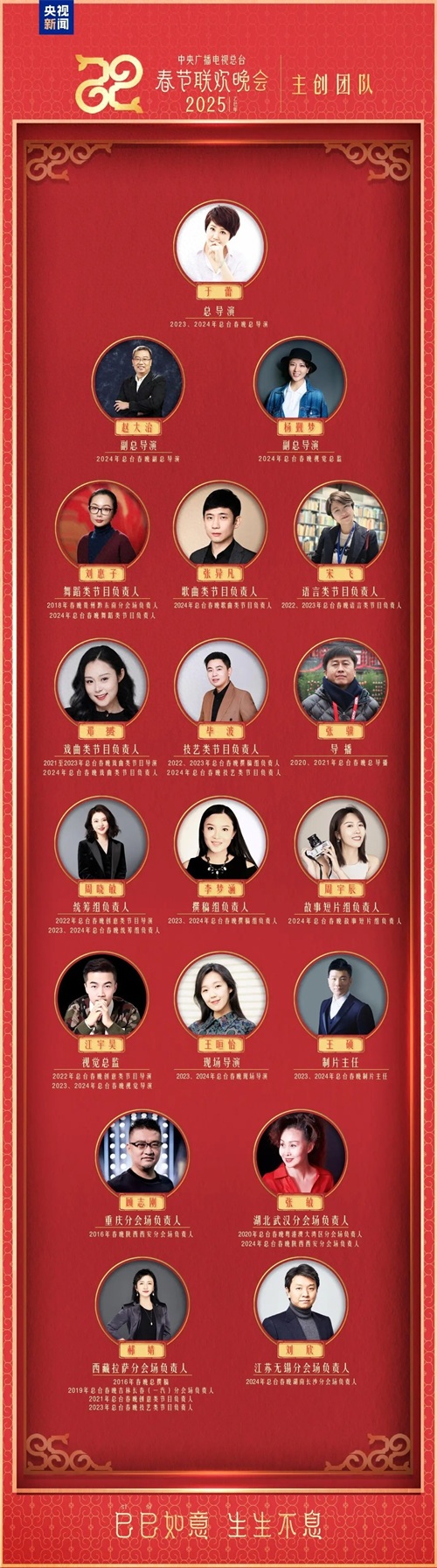 中央广播电视总台《2025年春节联欢晚会》正在紧锣密鼓筹备中。经上级部门批准,12月29日,春晚主创团队官宣:总导演于蕾,副总导演赵大治、杨觐梦,及刘惠子、张异凡、宋飞、邓赟、毕波、张骥、顾志刚、张敏、郝婧、刘欣等共同组成主创团队,全力推进2025年春晚创作。