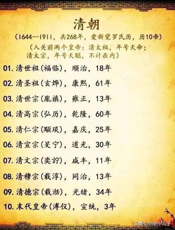 努尔哈赤皇顺康,雍乾嘉道咸同光;大清一共十二帝,末代溥仪最悲伤。小伙伴们记住了没?