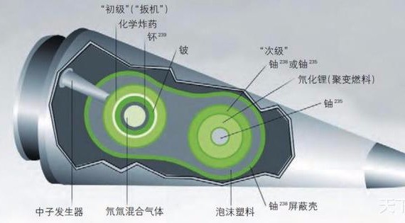 不过,早期的氢弹大多只有二级(核裂变-核聚变)结构,所以也被称为“二相弹”;而核大国为了进一步增加氢弹的杀伤力,就在“二相弹”的基础上加了一层由铀-235制成的外壳,让内部释放的中子轰击它,从而产生更大的能量,这就成了“三相弹”(核裂变-核聚变-核裂变),当然,不管是“二相弹”还是“三相弹”都属于氢弹!