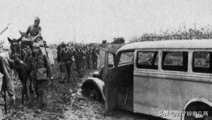 华北战场河北境内,日军正在行军,由于下过大雨,路面十分泥泞,路边可以看到被摧毁的小汽车。