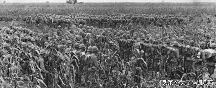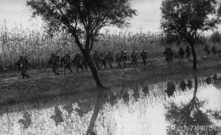正在行军的日军,后面是一片玉米地,可以看出日军当时的装备十分精良。