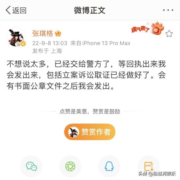 张琪格发布微博表示,此事不想说太多已经交给了警方处理,等到自己的报警回执出来会第一时间公布。