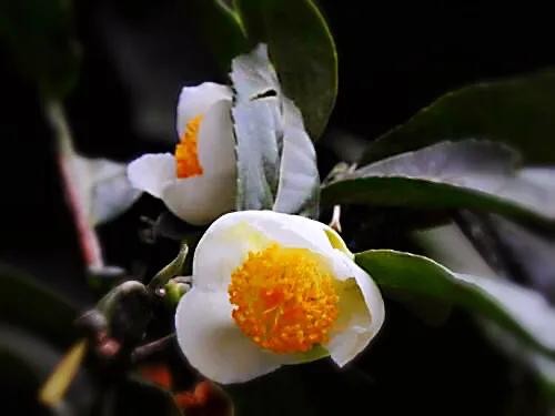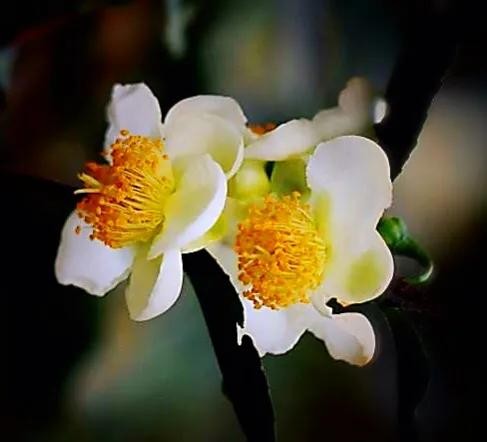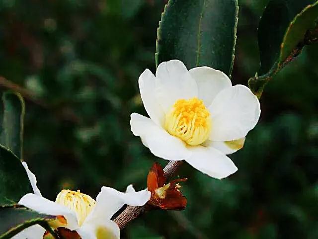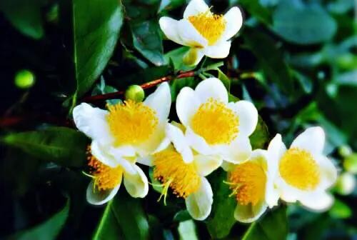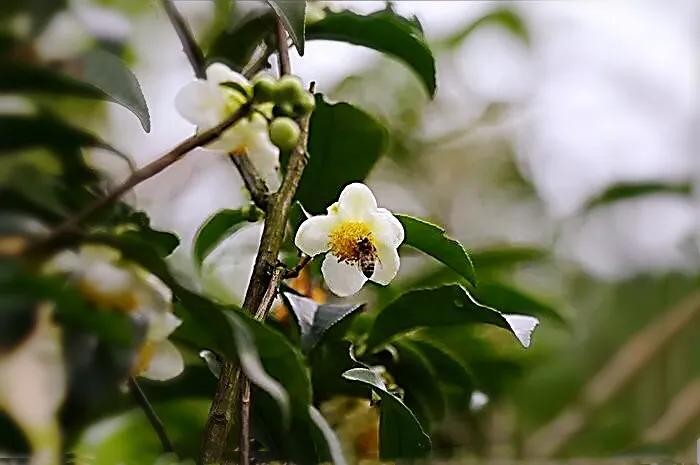 茶树花,由花瓣中有200~300个雄蕊,雌蕊位于雄蕊群的中央,成熟的茶树花分泌出的蜜汁,芬芳诱人。