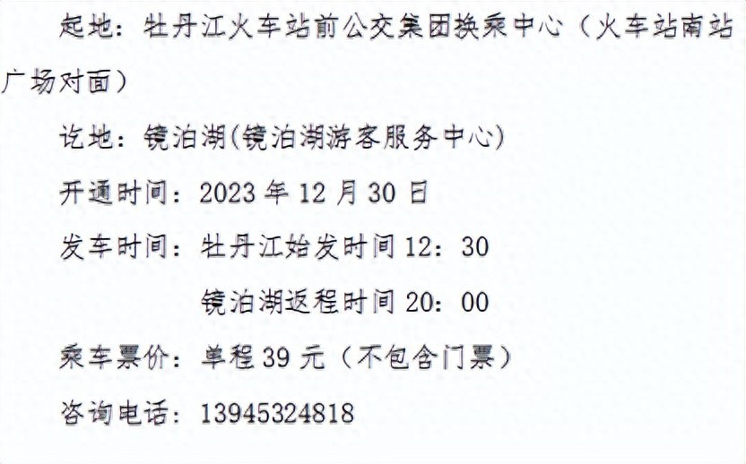 为深入贯彻落实习近平总书记在黑龙江视察时提出的“大力发展特色文化旅游”,“把黑龙江打造成冰雪旅游度假胜地和冰雪经济高地,把绿水青山、冰天雪地更好转化为金山银山”,按照牡丹江市委十三届四次全会精神,探索构建快旅慢游交通体系,谋划推进城区至重点景区旅游专线,打通旅游交通“最后一公里”的工作要求,现开通牡丹江至镜泊湖旅游直通车,具体信息如下: