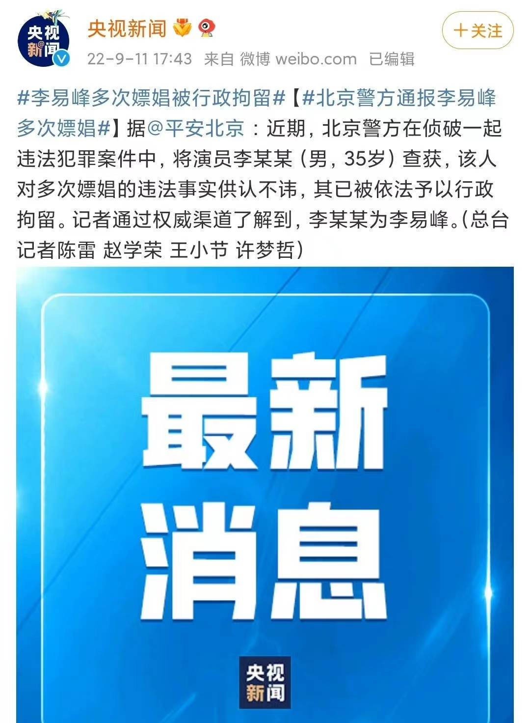 此前在9月11日,北京警方官方账号发布通报称演员李易峰涉嫌多次嫖娼,已被依法予以行政拘留。