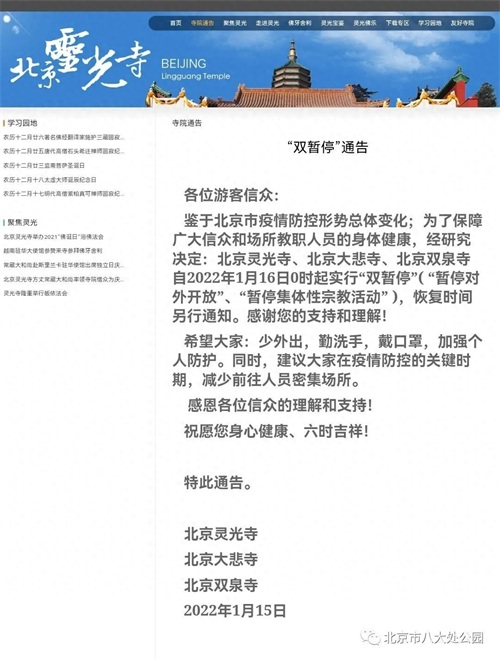 根据北京灵光寺官方消息,鉴于我市疫情防控总体变化,为保障广大信众和场所教职人员的身体健康,自2022年1月16日零时起二处灵光寺、四处大悲寺暂停对外开放、暂停集体性宗教活动,恢复时间另行通知。敬请您予以理解和支持!