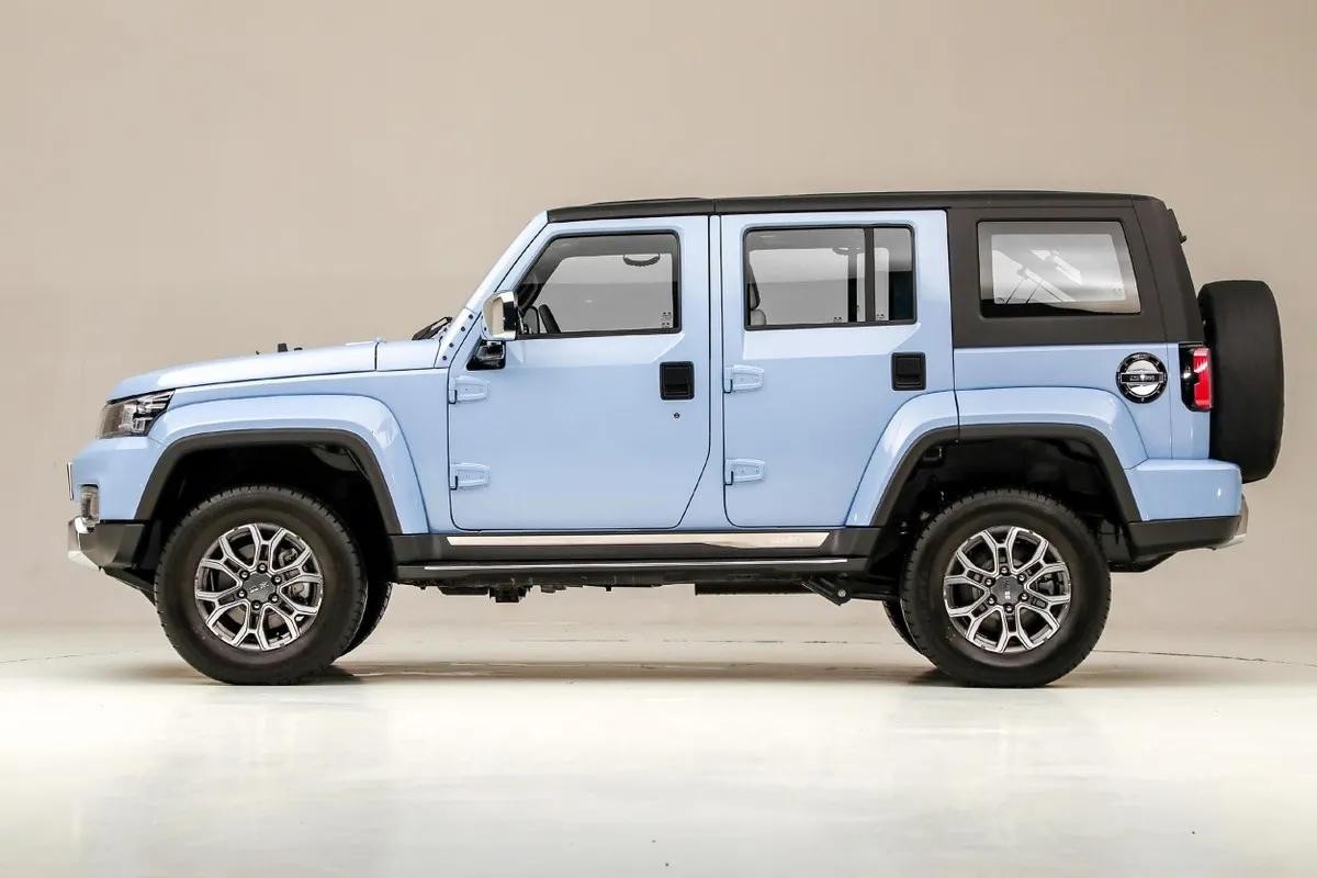 新车的侧面,一条非常有力度的腰线,搭配六辐式轮毂,既时尚又具有运动气息。粗壮的轮眉和侧裙,展现车辆的力量感。外漏的合页,高离地的车身,野性十足。高配车型配备脚踏。车顶可拆卸。车身尺寸方面,长宽高分别为4630,1925,1871,轴距为2745.